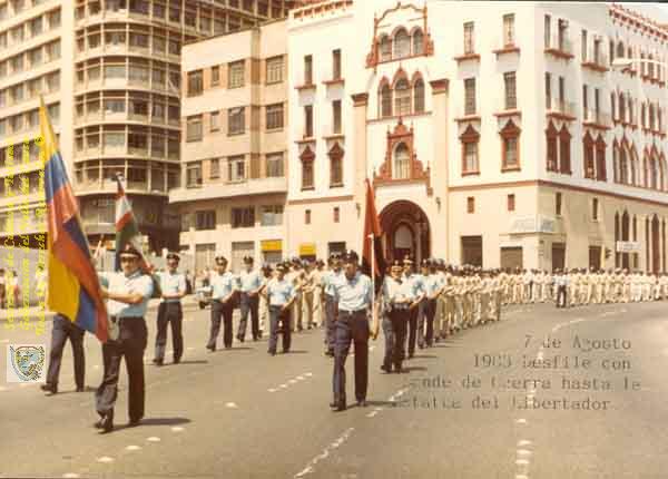 Desfile por la Avenida Colombia,con Banda de Guerra hasta la estatua del Libertador.Santiago de Cali, 07-08-1.983