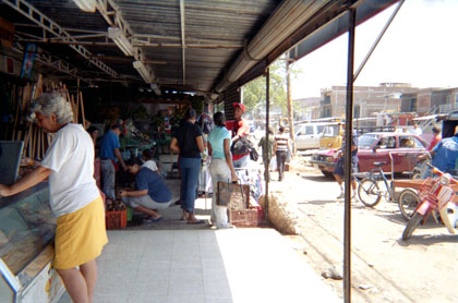 Plano general. Interior-exterior día. División de escena en dos laterales. Toma lateral de mujer en primer plano costado izquierdo. Sujetos de fondo.