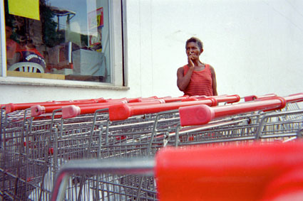 Plano medio. Imagen tomada en exterior donde se destaca una textura generada por varios carros para mercado. Al fondo una mujer de raza negra fumando. Al extremo izquierdo una ventana.