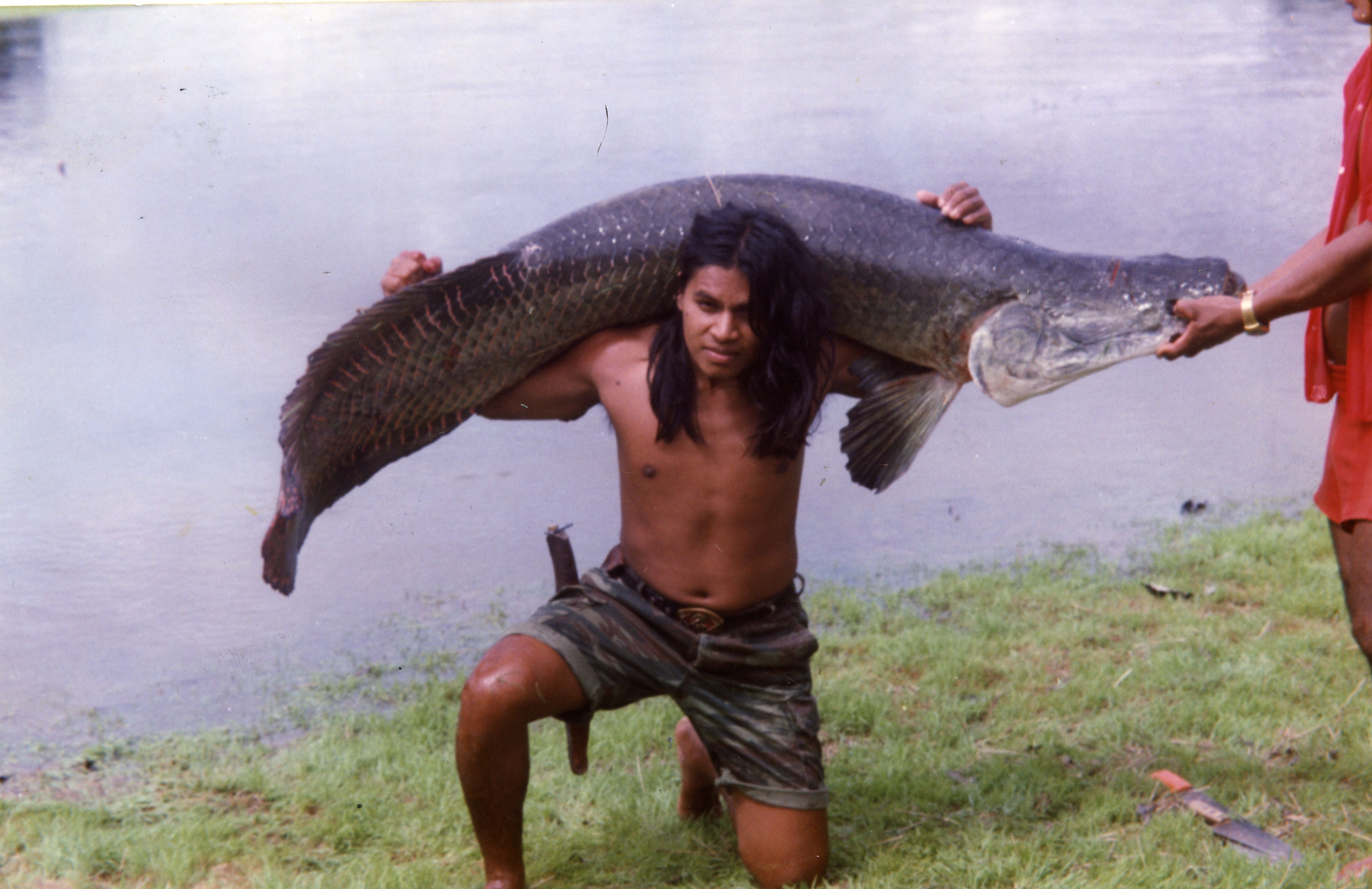 Hombre Mowgli carga sobre sus hombros un gigante Pirarucú
