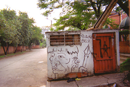 Plano Medio. En la imagen se observa en un primer plano una construcción de color blanco de la que se destaca un dibujo en color negro de un indígena con una flecha en su mano. Al extremo izquierdo se observa una vía y algunos árboles.