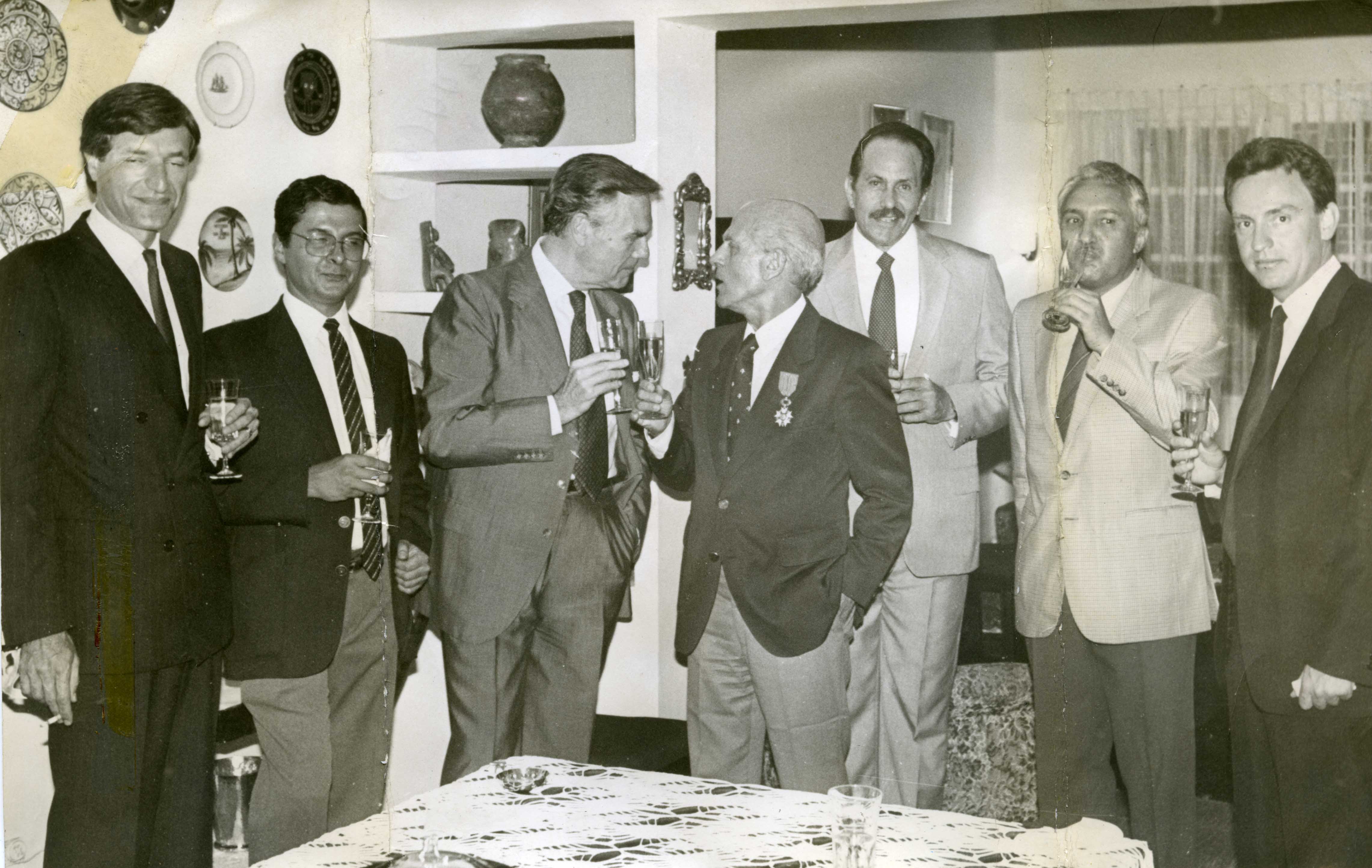 El señor Jean Exiga, fue condecorado por el Embajador de Francia en Colombia, Pierre de Boinsdeffre, con la legion de Honor, en reconocimiento a su extraordinaria labor cumplida en el consulado de la capital del Valle del Cauca, por espacio de 28 años. Durante la recepcion ofrecida con ese motivo, el señor Exiga, se encuentra departiendo con un grupo de invitados. El Archivo del Patrimonio Fotográfico y Fílmico del Valle del Cauca es responsabilidad de la Biblioteca Departamental del Valle Jorge Garcés Borrero, por convenio de cooperación suscrito con la Secretaria del Cultura Departamental, con el fin de aunar esfuerzos para su conservación, preservación y divulgación del Archivo entre la comunidad Vallecaucana, especialmente entre los estudiantes e investigadores que visitan la Biblioteca, propiciando el su uso y consulta permanente. La universidad Icesi es un colaborador en el proceso de difusión, facilitando la tecnología que permite la consulta de las imágenes.