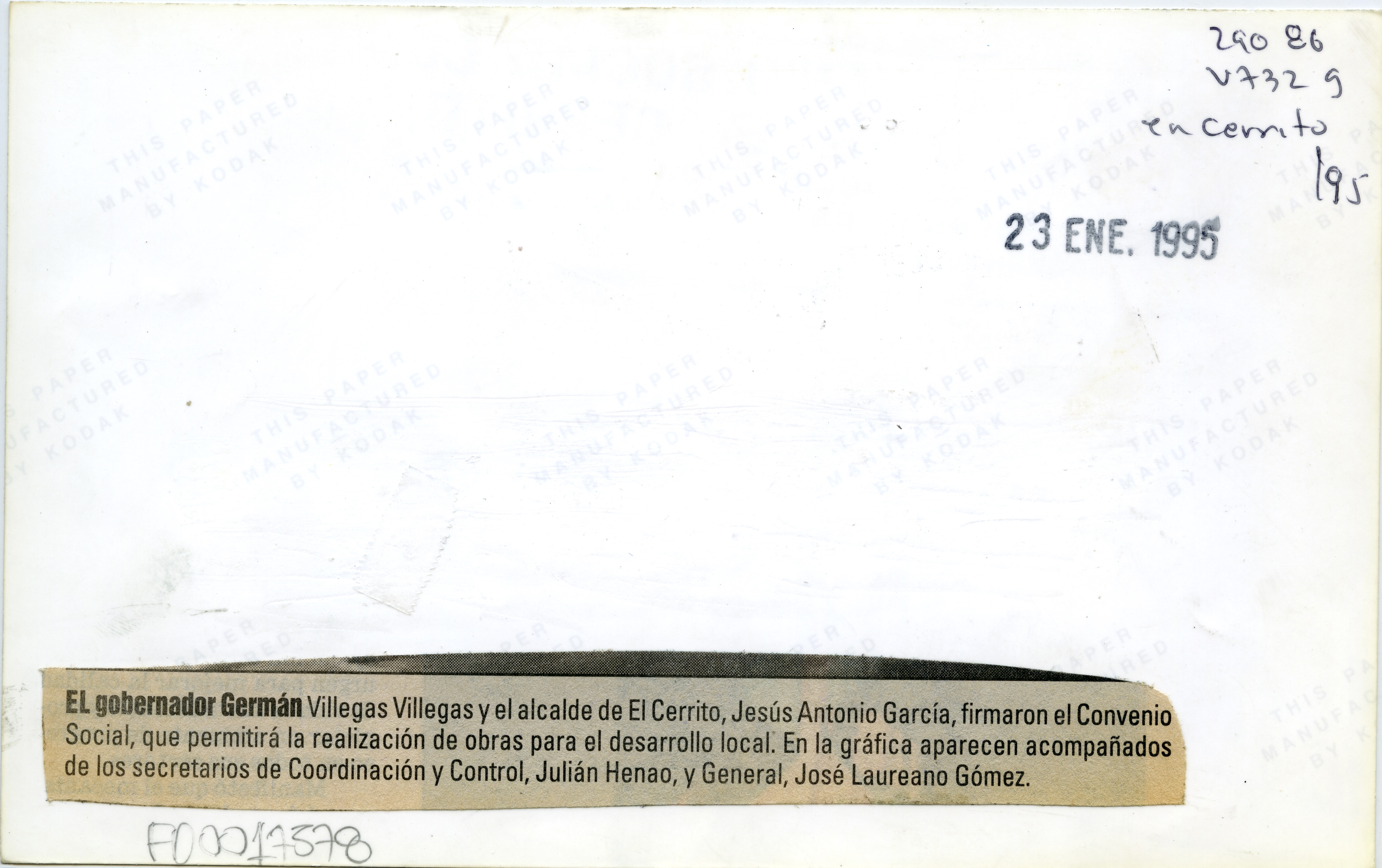 Gobernador firma convenio. Al reverso de la fotografía se anexa recorte: El gobernador Germán Villegas Villegas el alcalde de El Cerrito, Jesús Antonio García, firmaron el Convenio Social, que permitirá la realización de obras para el desarrollo local. En la gráfica aparecen acompañados de los secretarios de coordinación y control, Julián Henao, y general, José Laureano Gómez