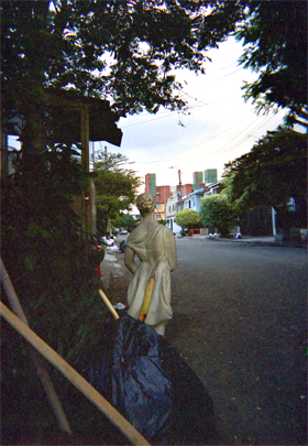 Acumulación de basuras en el lado izquierdo de la imagen en una calle de barrio. Sobresale una escultura femenina en contraplano. Al fondo edificaciones. Exterior día. Plano general.