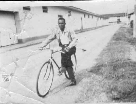 Italo Concha en su bicicleta por la calle cuarta, al lado derecho se encuentra el molino de arroz de Guacarí, uno de los principales renglones de la economía de este municipio. Guacari, 1965