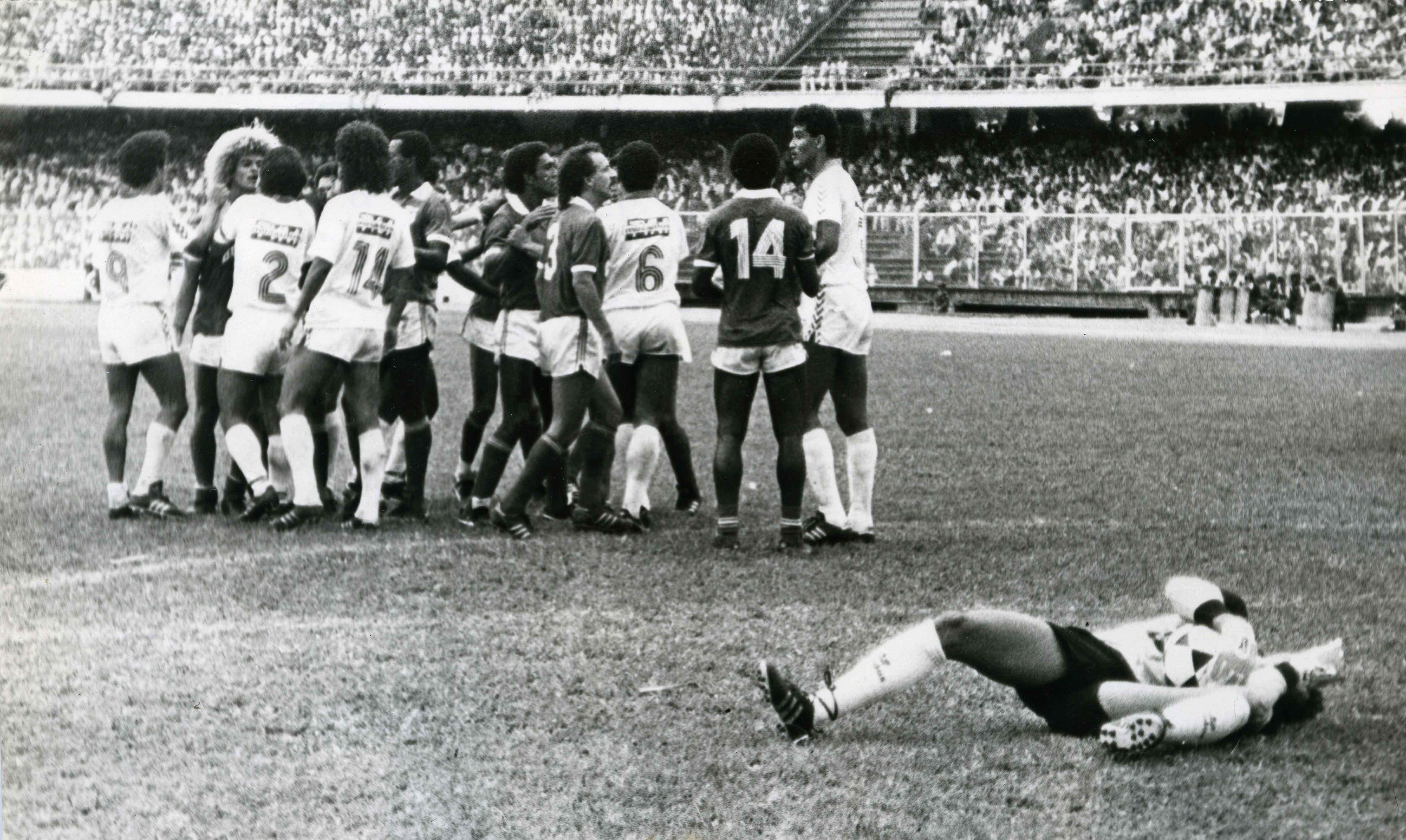 Cali vs Nacional. Jugadores discutiendo por una falta, observamos al "Pibe" Valderrama y a Alvaro Escobar.- El Archivo del Patrimonio Fotográfico y Fílmico del Valle del Cauca es responsabilidad de la Biblioteca Departamental del Valle Jorge Garcés Borrero, por convenio de cooperación suscrito con la Secretaria del Cultura Departamental, con el fin de aunar esfuerzos para su conservación, preservación y divulgación del Archivo entre la comunidad Vallecaucana, especialmente entre los estudiantes e investigadores que visitan la Biblioteca, propiciando el su uso y consulta permanente. La universidad Icesi es un colaborador en el proceso de difusión, facilitando la tecnología que permite la consulta de las imágenes.
