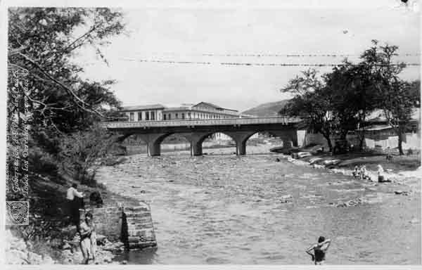 Puente sobre el río. Se aprecian algunos bañistas. Pradera, 1950.