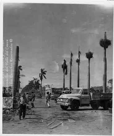 Las palmas de la avenida Miguel López Muñoz (Hoy calle 25), también se vieron afectadas por la explosión del 7 de agosto. Santiago de Cali, 07-08-1956.