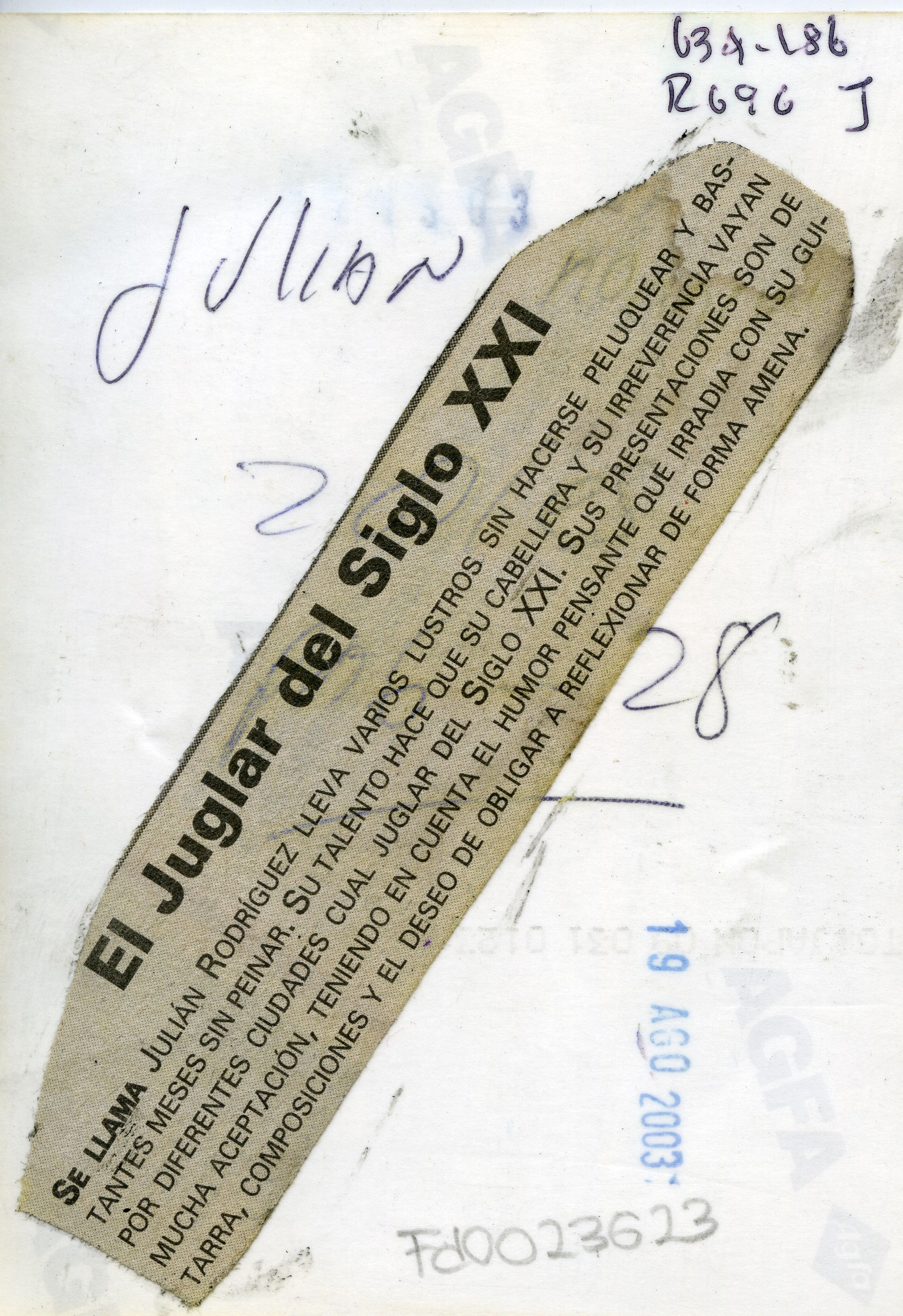 Reverso: Se llama Julián Rodríguez lleva varios lustros sin hacerse peluquiar y bastante meses sin peinar. Su talento hace que su cabellera y su irreverencia vayan por diferentes ciudades cual juglar del siglo XXI. Sus presentaciones son de mucha aceptación, teniendo en cuenta el humor pensante que irradia con su guitarra, composiciones y el deseo de obligar a reflexionar de forma amena