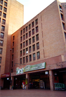 Primer plano. Edificio. Simetría. Sobredimensión de edificio por encuadre. Formas cuadriculares que se repiten. Publicidad de supermercado. Contraste de superficie terracota con verde de aviso. Sujetos en franja inferior.