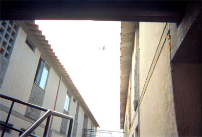 Contrapicado. Avión como punto distintivo. Perspectiva y paralelismo lineal formado por aleros de conjunto de viviendas.