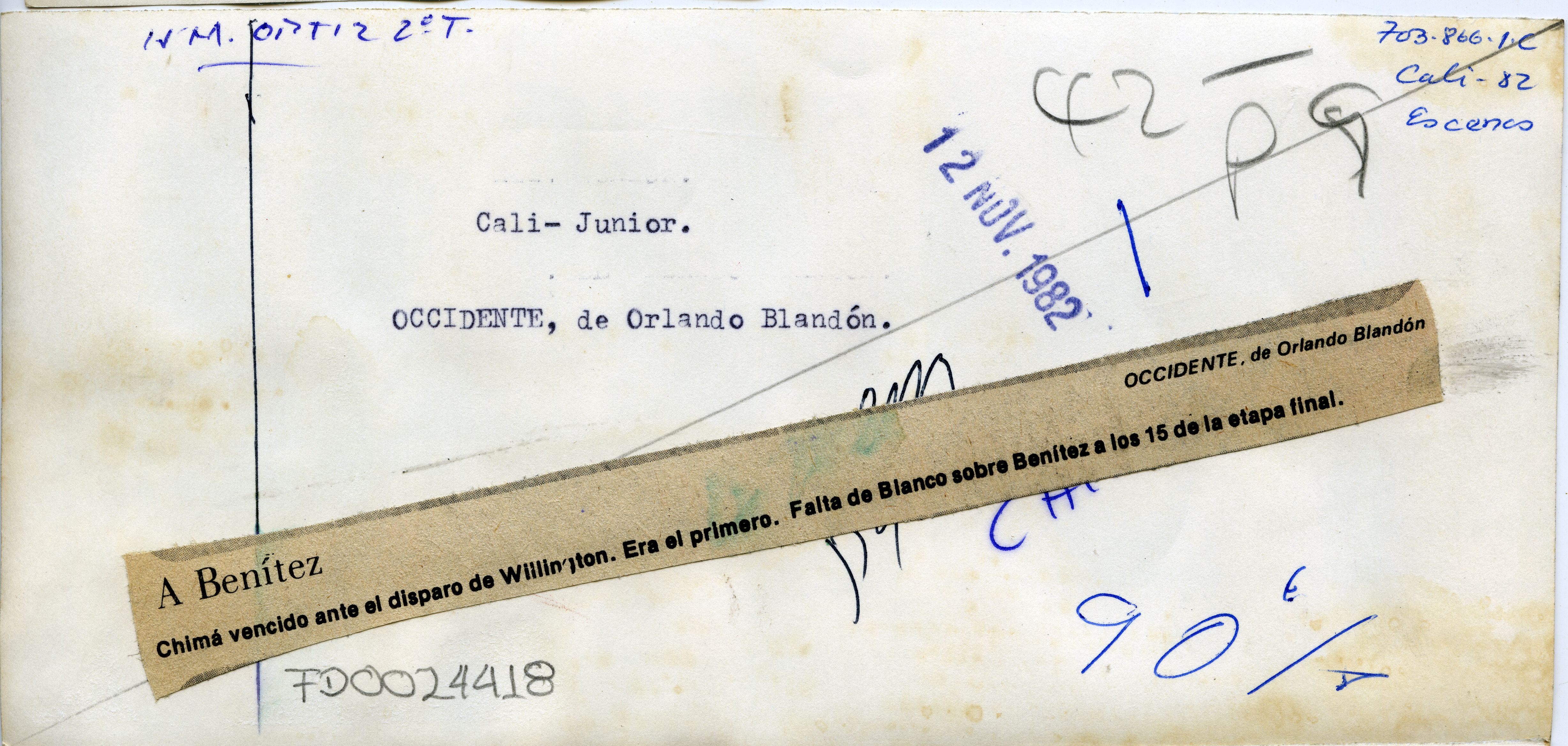 Occidente, de Orlando Blandón. reverso de la fotografía se anexa recorte: A Benítez. Chimá vencido ante el disparo de Willington. Era el primero. Falta de Blanco sobre Benítez a los 15 de la etapa final