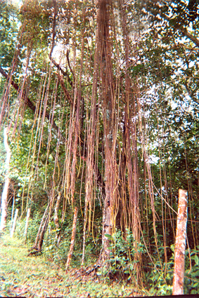 Plano medio. Exterior día. La fotografía vertical se agudiza con las lianas que penden de los árboles hacia abajo. El sol se filtra entre las hojas.