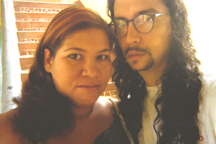 Primer Plano. En la imagen se observa una pareja frente a unas escaleras. Al extremo derecho un hombre delgado de cabello largo con gafas y barba en forma de candado, junto a él, a la izquierda una mujer con cabello largo e iluminaciones color rojizo.