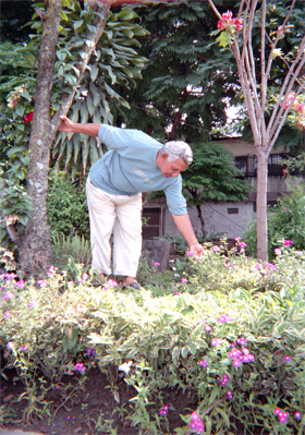 Plano general. Hombre cuidando las plantas en jardín exterior de viviendas. Variada vegetación. Al fondo viviendas. Exterior día.