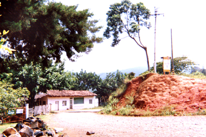 Plano general de curva de camino destapado de zona rural. Una casa autóctona de la región con techo de teja está al borde del camino. Un terraplén de tierra con árbol, poste y letrero al lado derecho.