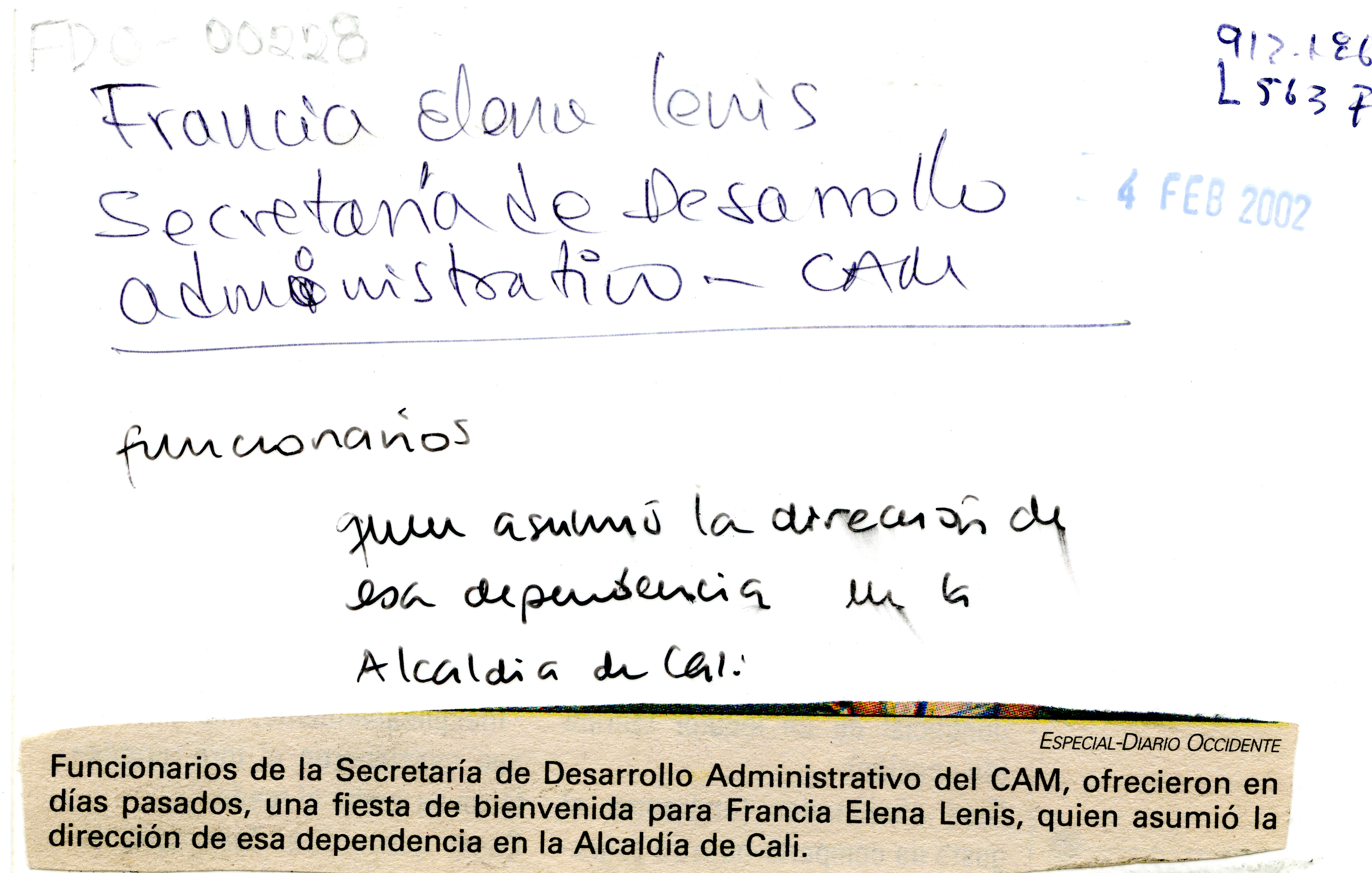 Diario de Occidente (2002). Fiesta de bienvenida para Francia Elena Lenis, quien asumió el cargo de secretaria de desarrollo administrativo (CAM). Santiago de Cali.: Biblioteca Departamental Jorge Garcés Borrero..