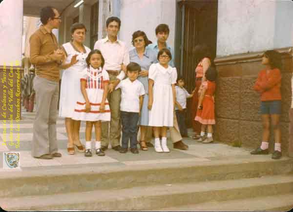 Josefina, Padre Cañas, Luis Eduardo, Sofia, Luis Alfonso, Luz marina, Gabriel y Adiela, preparandose para ir misa. En el Valle del Cauca es tradición ir a misa los domigos con todos los miembros del núcleo familiar. Versalles, 1980.
