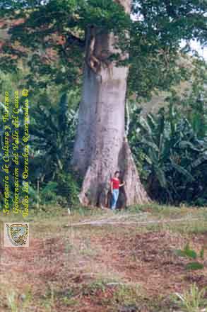 María Luisa Hurtado de Vázquez junto a una frondosa y centenaria ceiba de la Hacienda el Bono. Dagua. 2000.