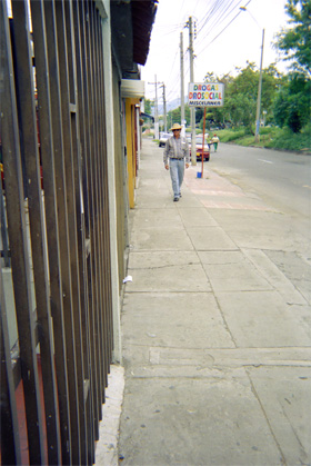 Plano general. En primer plano rejas de viviendas. En el plano medio el vigilante de la cuadra caminando en dirección a cámara. Atrás de él letrero de droguería. En el plano medio. Al fondo zona verde.