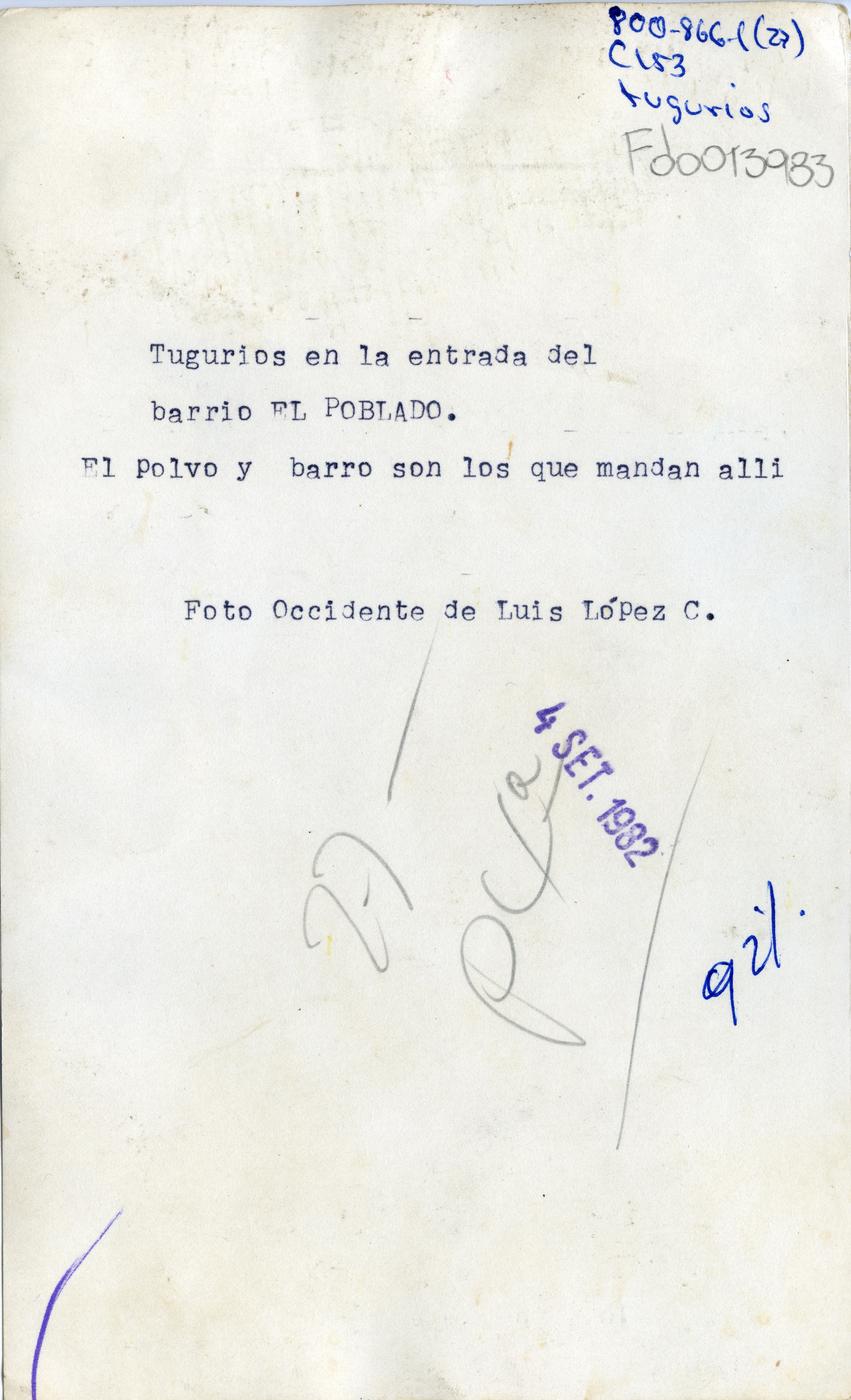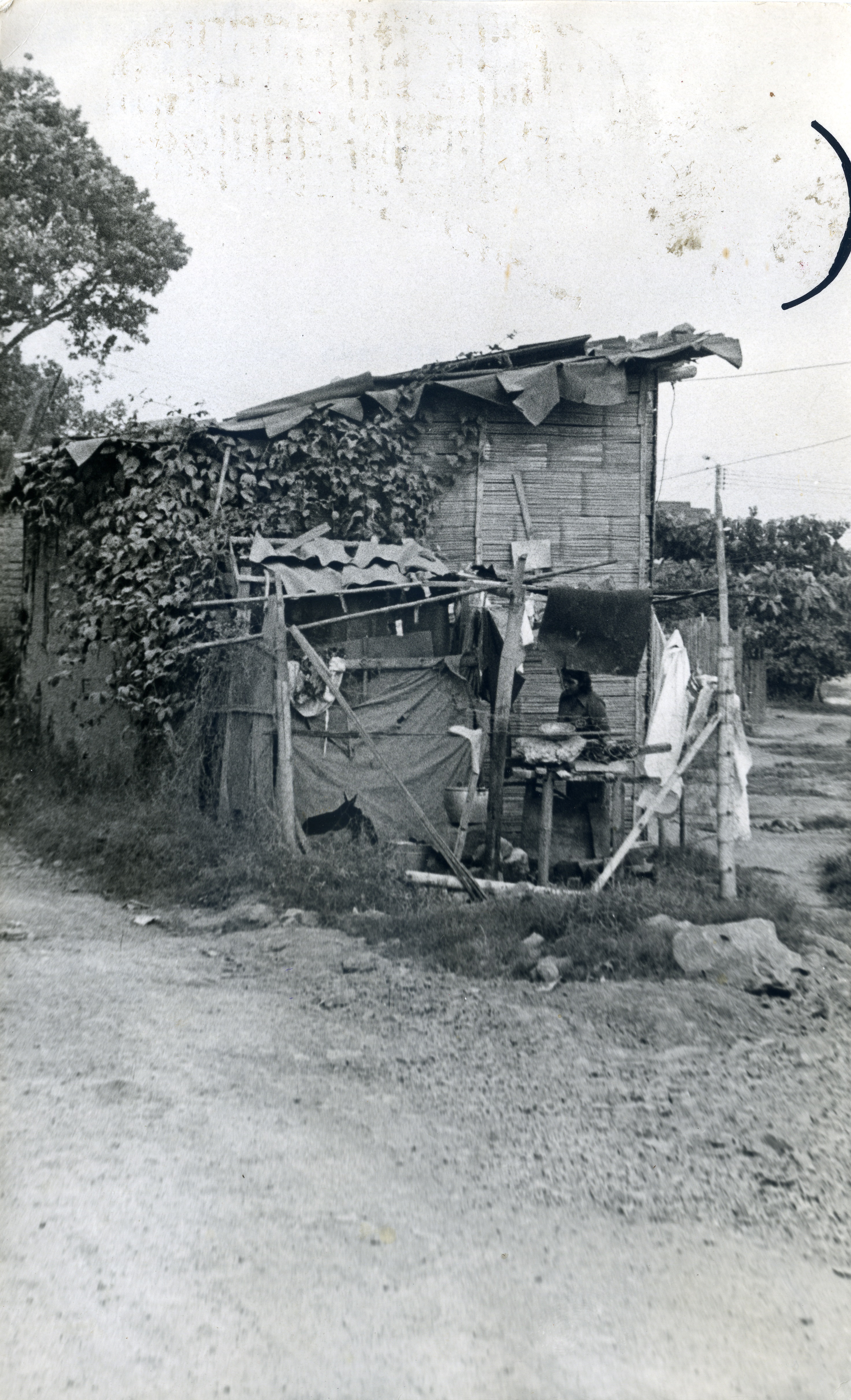 Barrio poblado. Al reverso de la fotografía se describe: "Tugurios del barrio El Poblado. El polvo y el barro son los que mandan allí". Se observa una vivienda construida en esterilla.