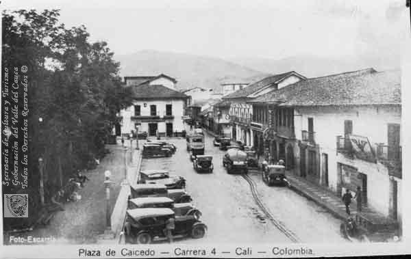 s. n., s. n. & s. n. (1936). Carrera 4ª y Plaza Cayzedo, alrededor las berlinas de la época & 200392. OTRO: Biblioteca Departamental Jorge Garces Borrero.