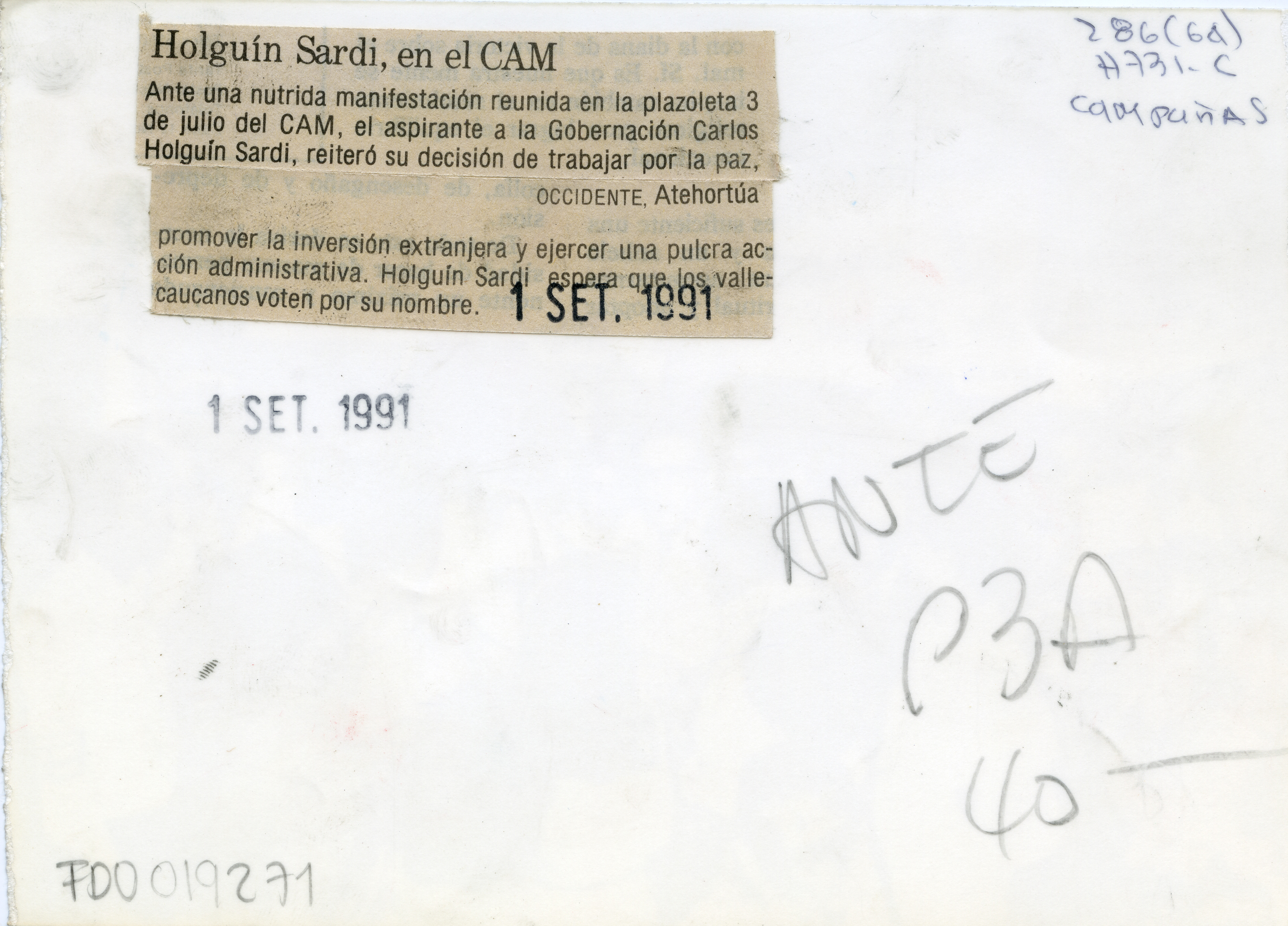 En la fotografía podemos observar una gran cantidad de personas reunidas en el CAM, demostrando su apoyo a la campaña política del conservador Carlos Holguín Sardi. Al reverso de la fotografía se anexa recorte: "Holguín Sardi en el CAM. Ante una nutrida manifestación reunida en la plazoleta 3 de julio del CAM, el aspirante a la gobernación Carlos Holguín Sardi, reiteró su decisión de trabajar por la paz, promover la inversión extranjera y ejercer una pulcra acción administrativa. Holguín Sardi espera que los vallecaucanos voten por su nombre."