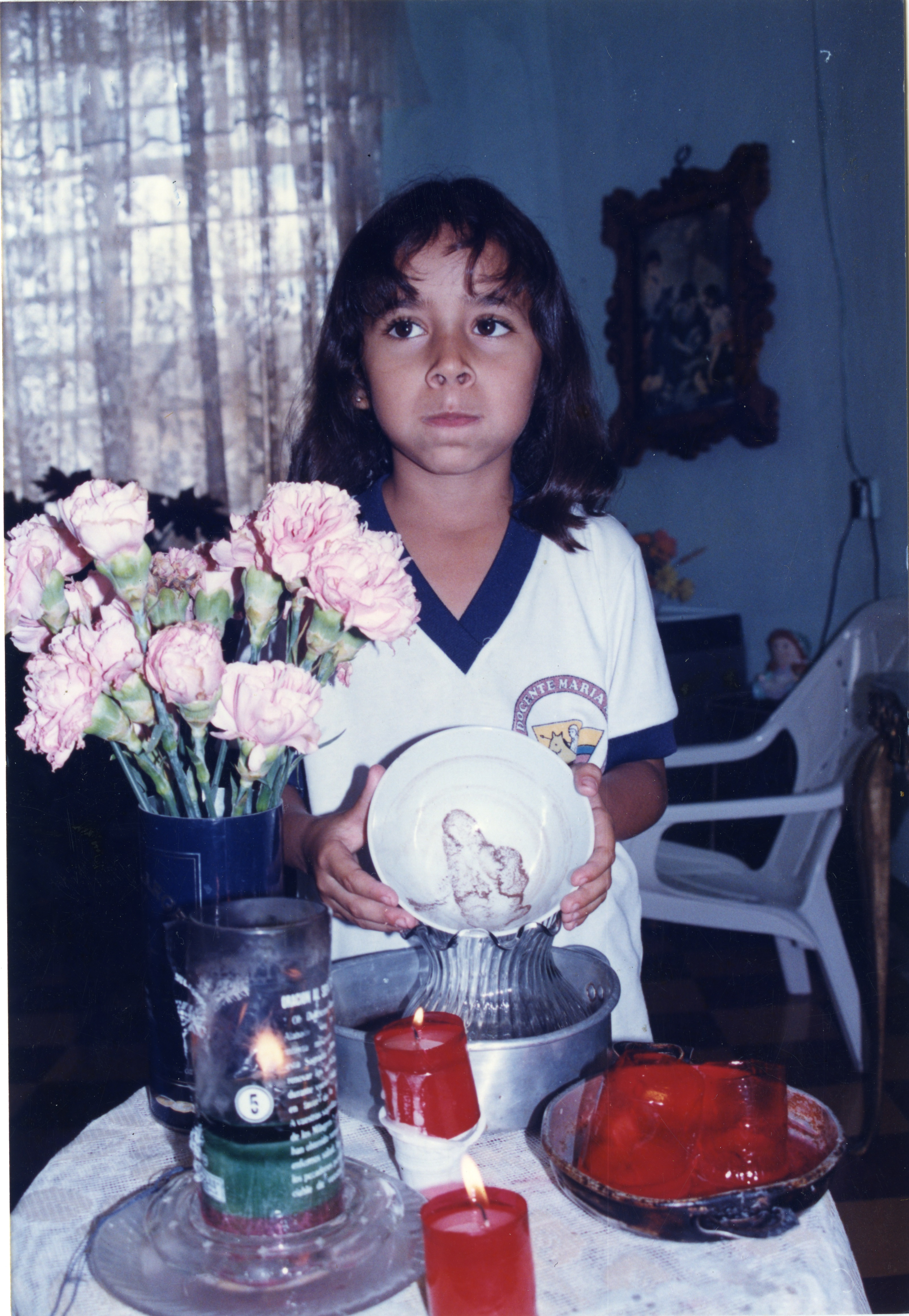 Niña sostiene taza de cerámica junto a altar a la Virgen del Carmen en supuesta aparición divina.