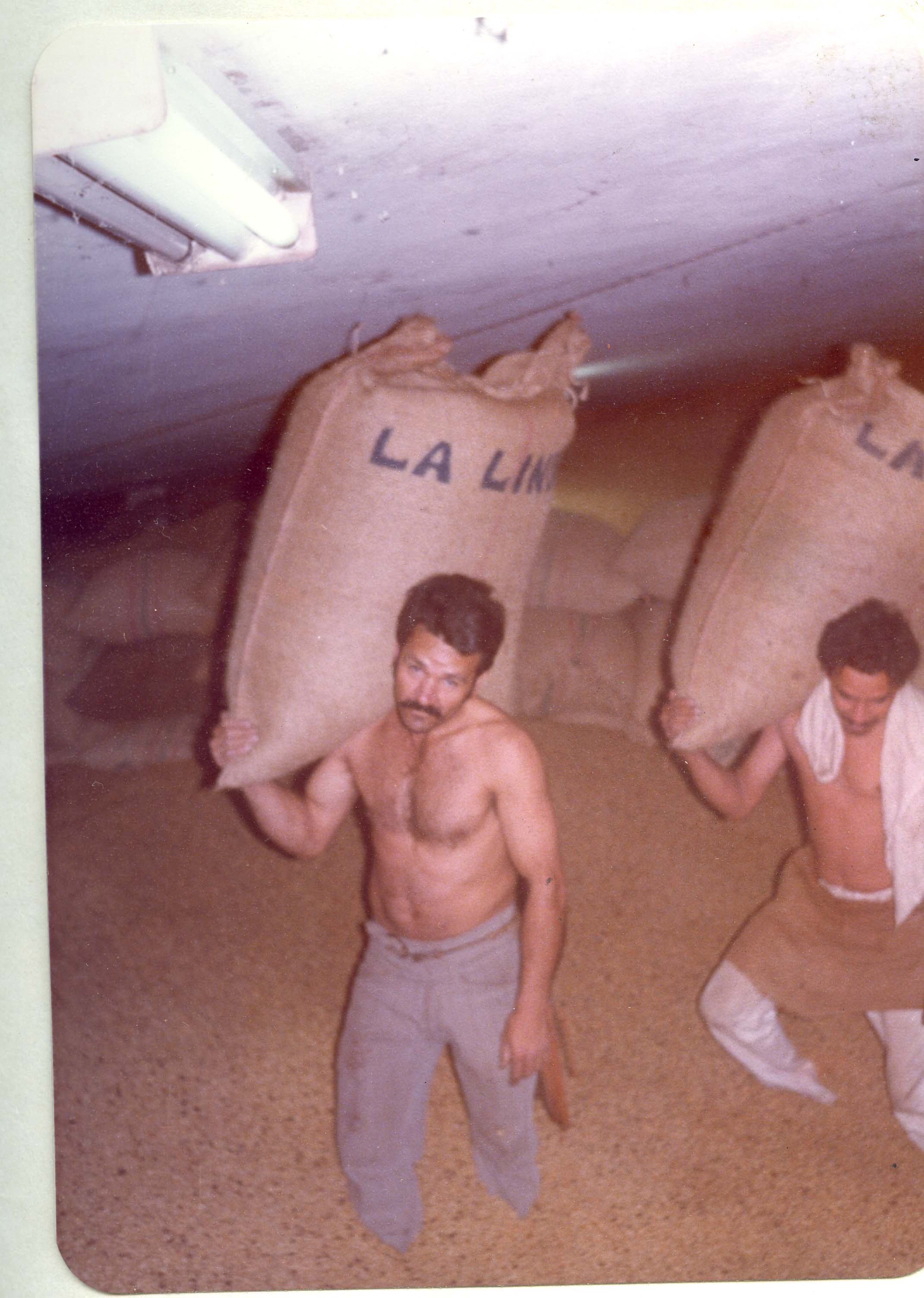 Sevilla, Valle del Cauca. Fundado en 1903, por Heraclio Uribe y Colonos antioqueños y caldenses. Nombres: San Luis. Municipio desde 1914. Economía importante en agricultura, caficultura, riqueza natural, comercio, la minería, explotación forestal, industria, etc. Observamos en la imagen, dos hombres de oficio bracero cargando bulto de café. Se aprecia abundante café en la bodega