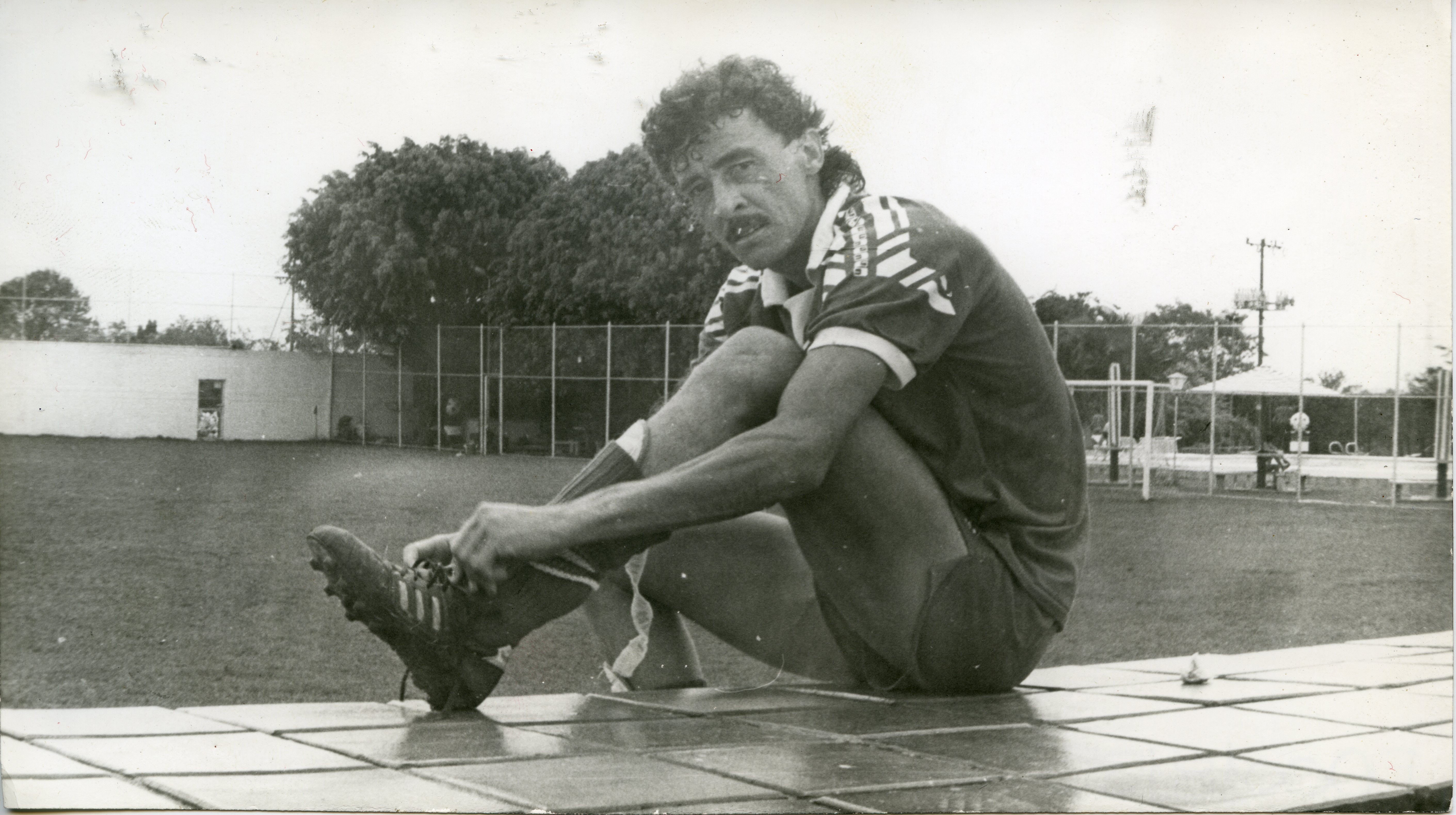 Amarrar los guayos de Carlos Mario Hoyos antes del entreno. jugador del América de Cali