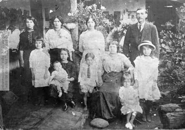Integrantes de la familia Góngora Irurita en los jardines internos de la casa materna. Pradera. C. 1925. Hasta poco después de los años 60's, las familias eran numerosas llegando a tener diez y más hijos.