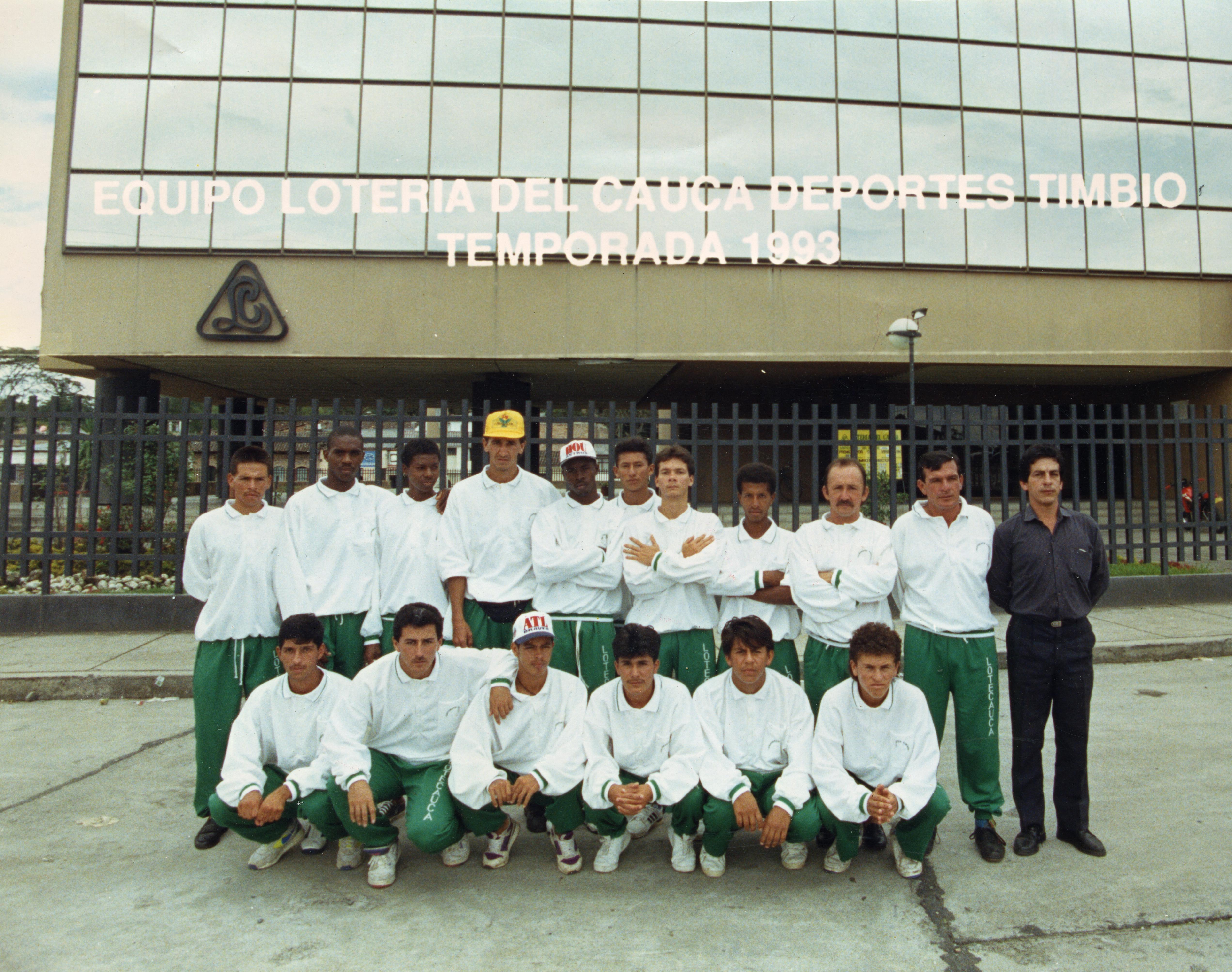 En la gráfica Equipo Loteria del Cauca Deportes Timbío temporada 1993. Se aprecia jugadores posando para la foto