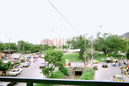 Plano general. Imagen tomada en exterior, desde un puente peatonal, donde se puede apreciar una vía pavimentada con un caño en el centro al fondo una glorieta y algunos edificios.