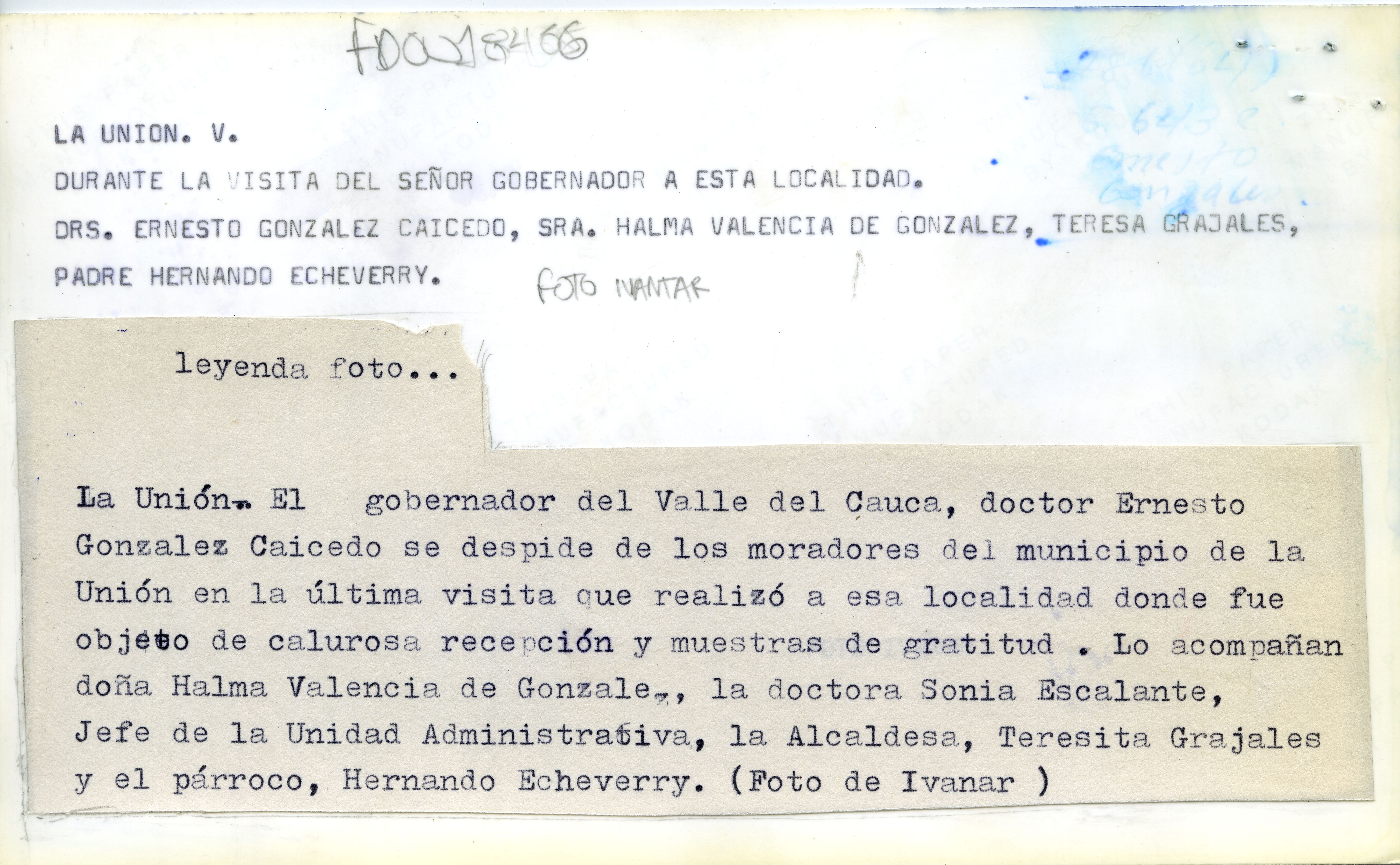 Al reverso de la fotografia se anexa recorte: "La Unión, El Gobernador del Valle del Cauca, Doctor Ernesto Gonzalez Caicedo se despide de los moradores del municipio de la Unión en la ultima visita que realizo a esa localidad donde fue objeto de calurosa recepción y muestras de gratitud. Lo acompañan doña Halma Valencia de Gonzalez, la doctora Sonia Escalante jefe de la unidad administrativa, la alcaldesa Teresita Grajales y el parroco Hernando Echeverry