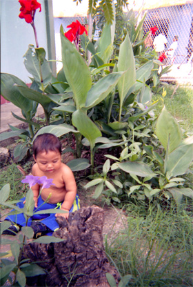 Plano general. Niño pensativo sentado en medio de vegetación. Al fondo malla y vecinos en la calle.