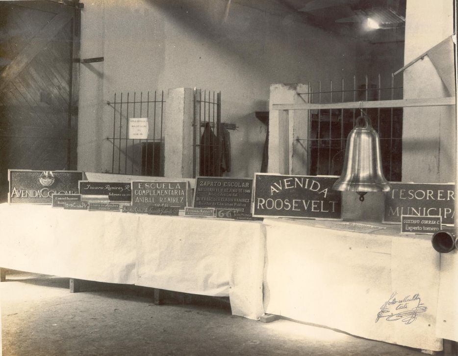 Exposición de los trabajos realizados por los estudiantes del taller de fundición, de la Escuela de Artes y Oficios. A partir de 1945 se le empezo a llamar Instituto Antonio José Camacho. En la actualidad se cononoce como Instituto Educativo Técnico Industrial Antonio José Camacho. Santiago de Cali, fecha aproximada, 1943.