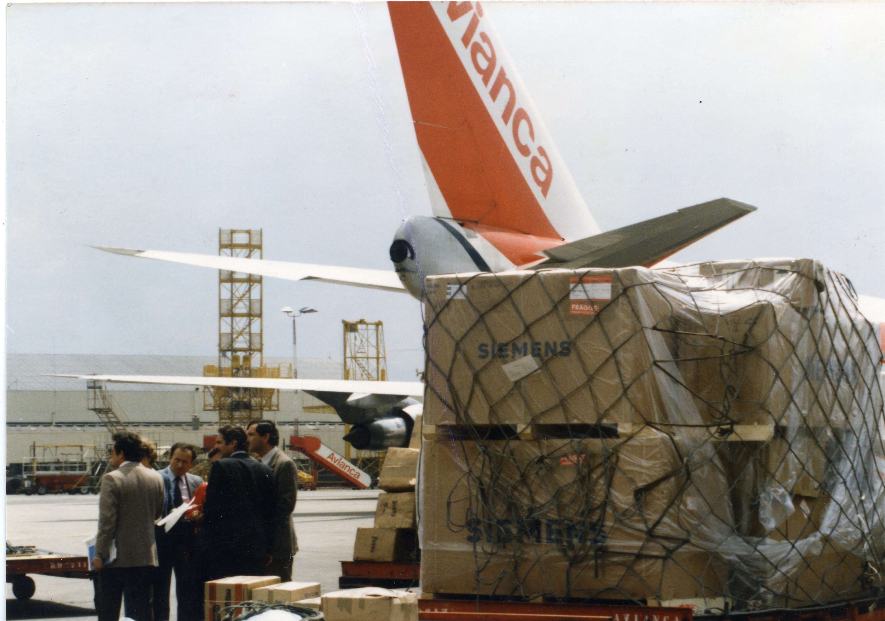 Paquetes de carga (Industria Siemens) en pista de aterrizaje y abordaje, al fondo avión de aerolinea Avianca, al interior del Aeropuerto Alfonso Bonilla Aragón en zona franca de Palmaseca.