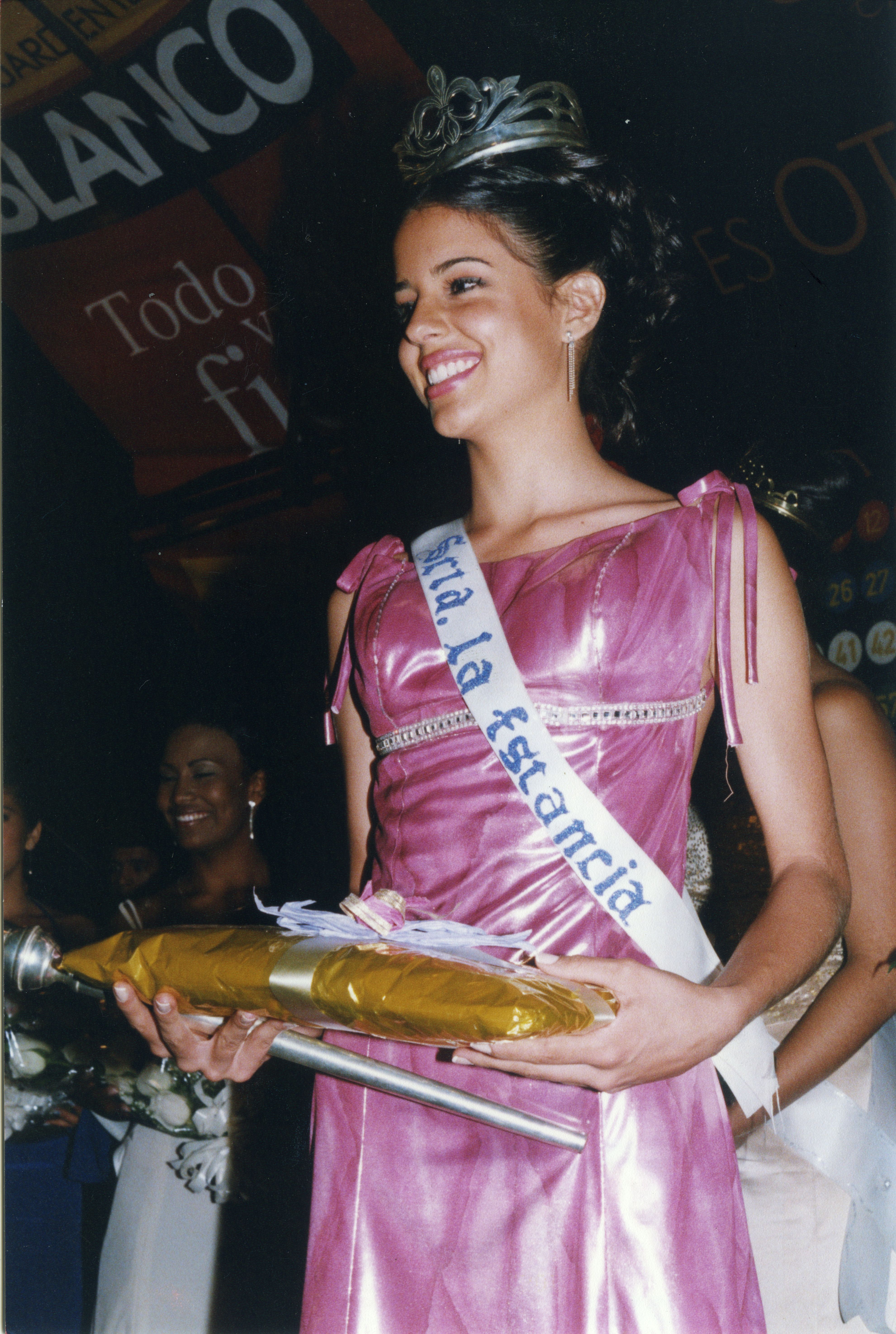 Plano medio largo de la Reina de las Ferias de Yumbo, Lady Carolina Bravo Ramirez. Sostiene el cetro y un regalo.