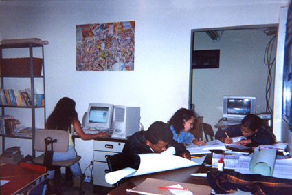 Interior de habitación donde se encentran varias personas concentradas estudiando. Podemos distinguir computadores, elementos de papelería en general y una estantería con libros.