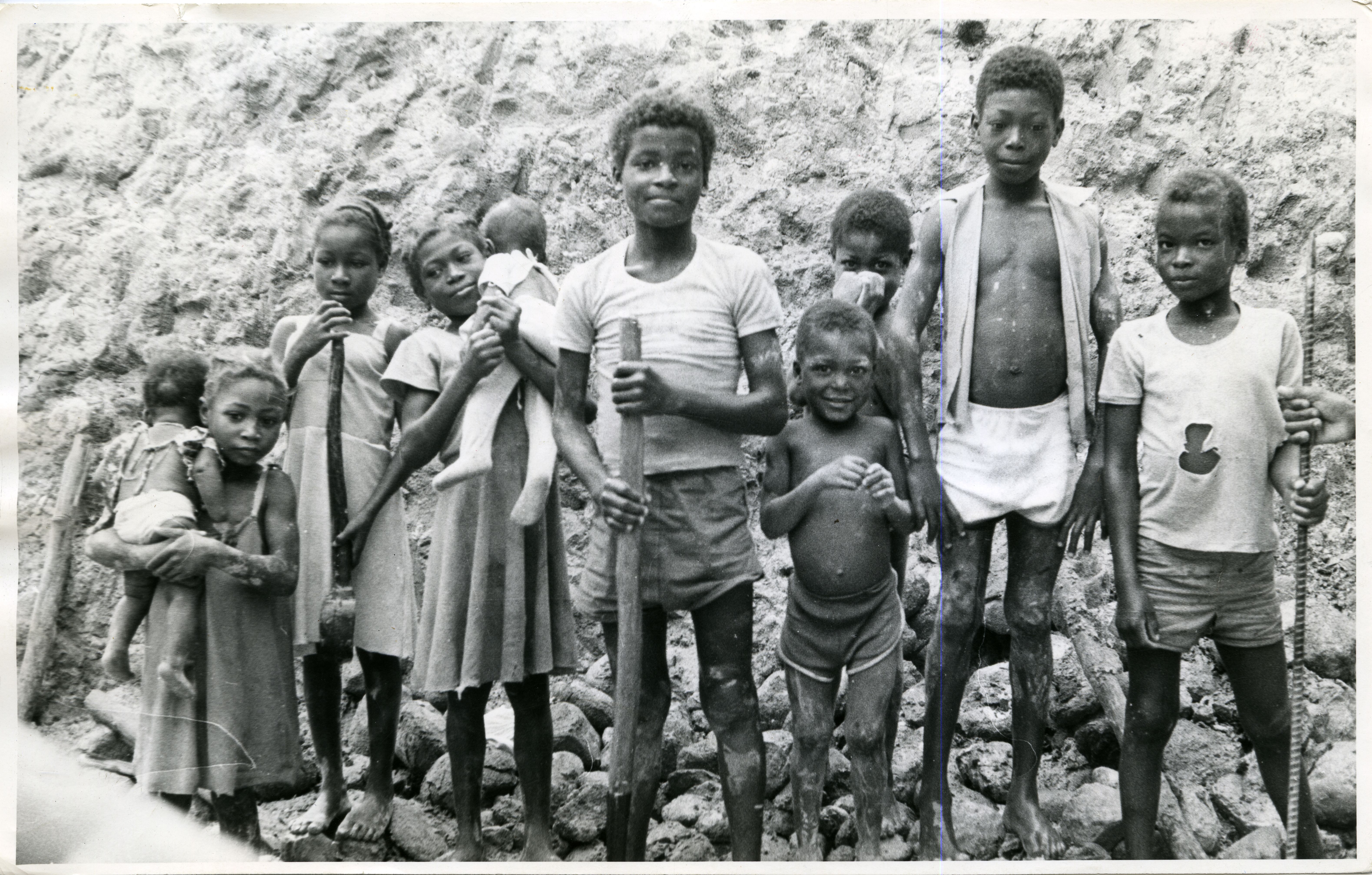 Se aprecia grupo de niños campesinos con herramienta manual. A los niños feliz domingo
