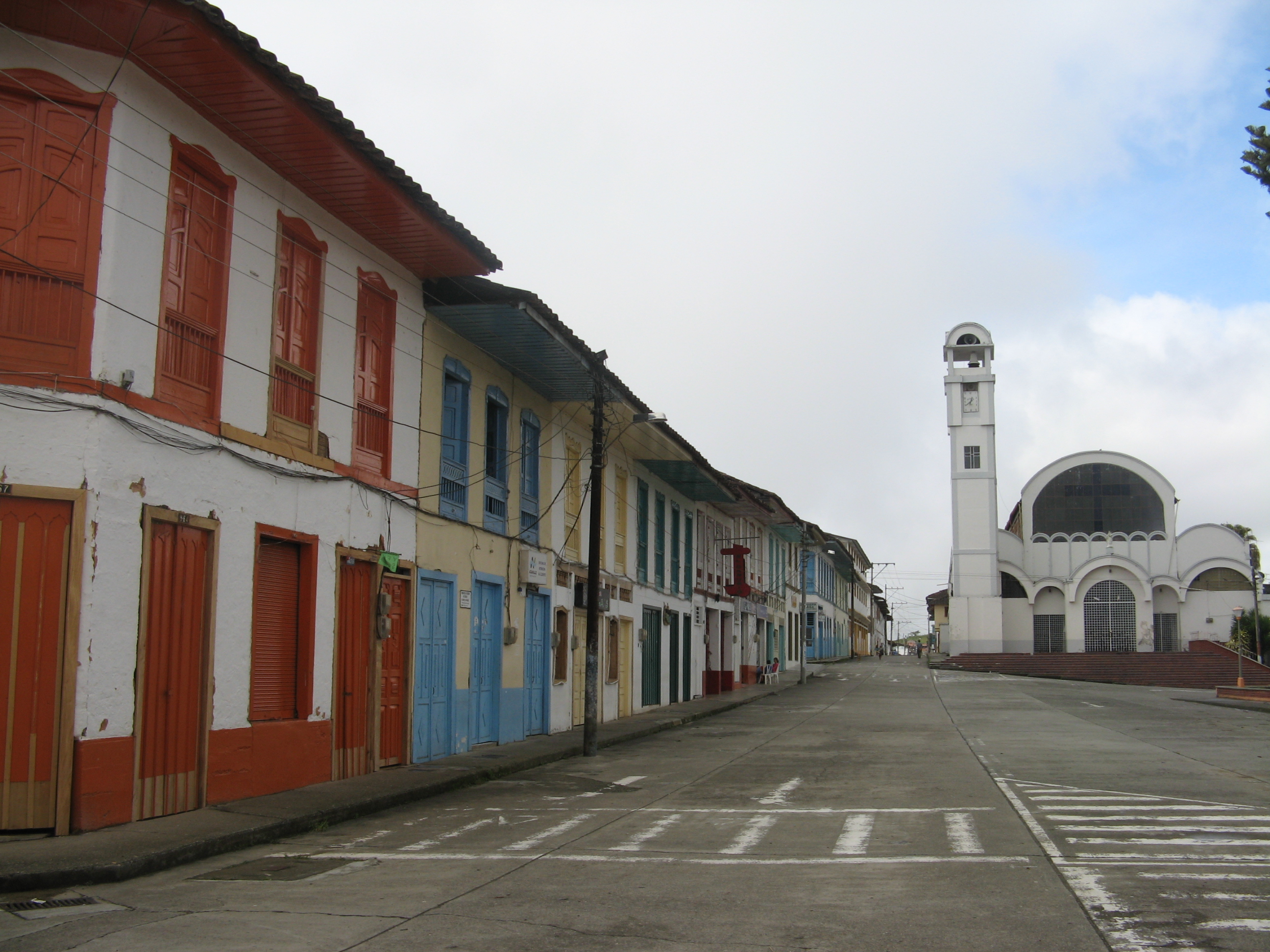 El Cairo, Valle del Cauca. Fundado en 1920, por Pedro Arango y otros. Nombres: Las Vueltas, Haceldama. Municipio desde 1947. Economía importante en agricultura, caficultura, entre otros. Atractivo turístico es su Bosque Natural de Las Amarillas en la Serranía del paraguas. Observamos en la imagen, Se aprecia la iglesia, la calle, y las viviendas típicas