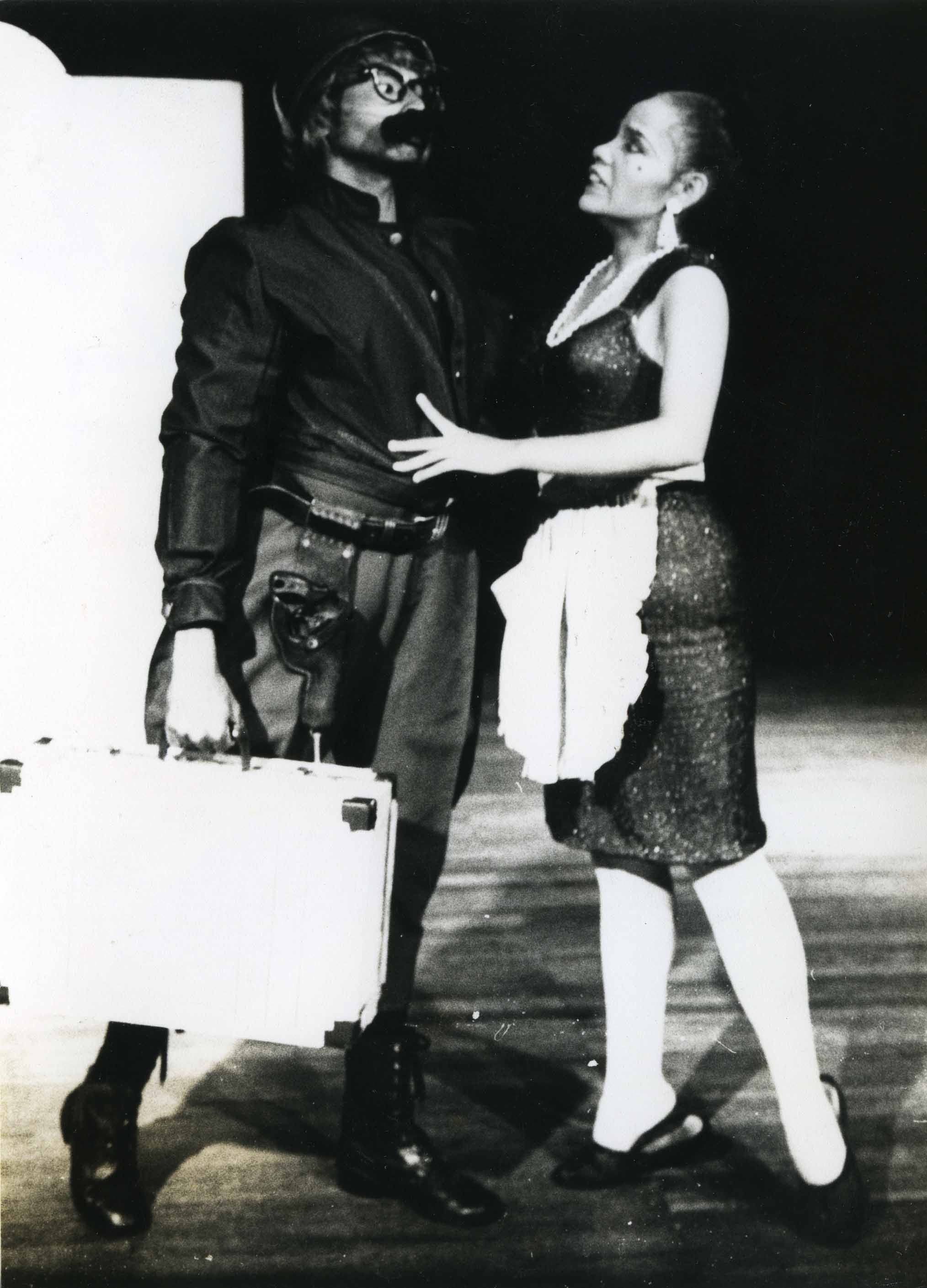 En el pie de foto dice lo siguiente: Obra, El enmaletado, creación: Colectiva; en escena: Alexandra Hoyos y Jesús M Mina.- El Archivo del Patrimonio Fotográfico y Fílmico del Valle del Cauca es responsabilidad de la Biblioteca Departamental del Valle Jorge Garcés Borrero, por convenio de cooperación suscrito con la Secretaria del Cultura Departamental, con el fin de aunar esfuerzos para su conservación, preservación y divulgación del Archivo entre la comunidad Vallecaucana, especialmente entre los estudiantes e investigadores que visitan la Biblioteca, propiciando el su uso y consulta permanente. La universidad Icesi es un colaborador en el proceso de difusión, facilitando la tecnología que permite la consulta de las imágenes.