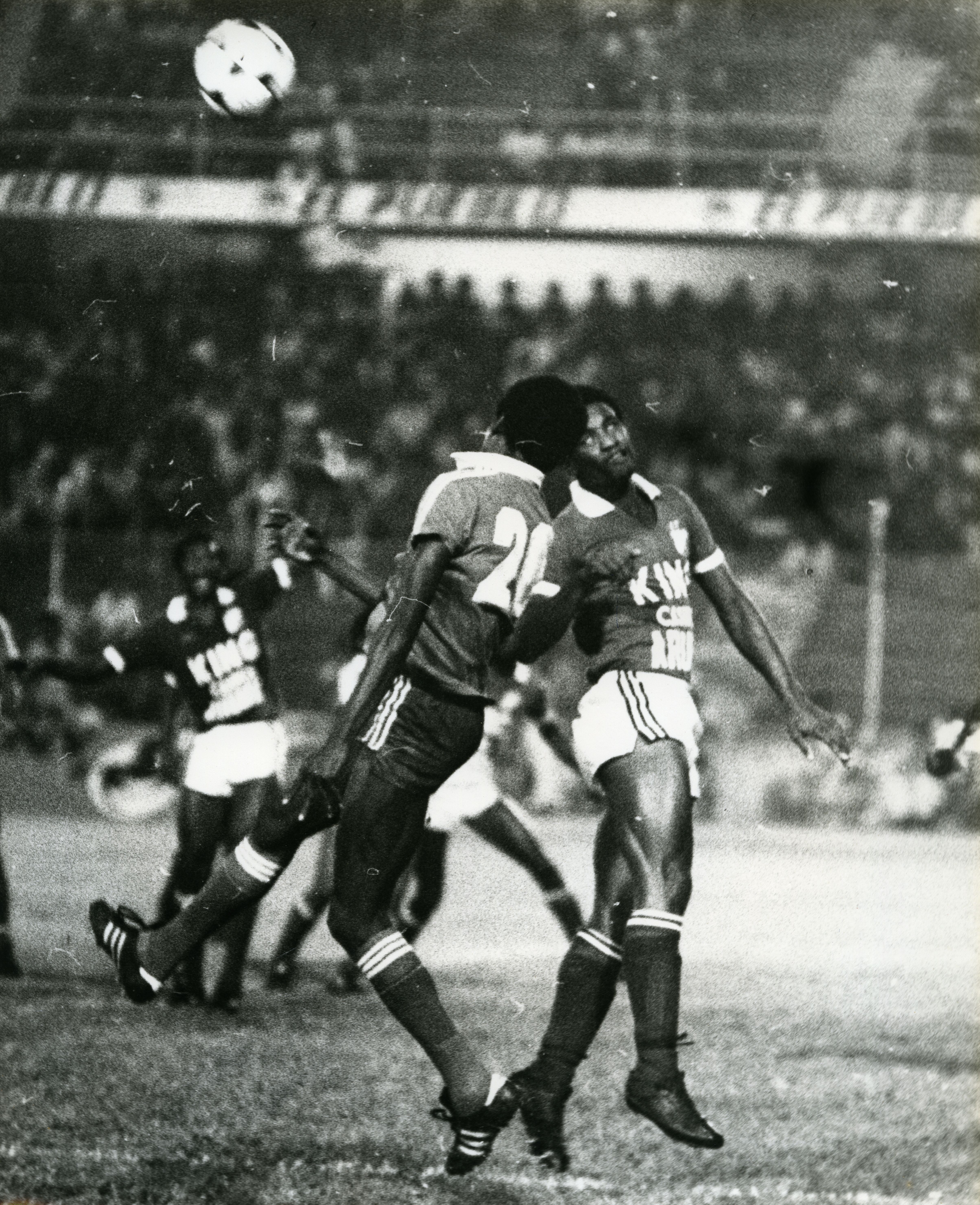 América de Cali, equipo de fútbol de la ciudad de Santiago de Cali, Valle del Cauca. Fue fundado oficialmente en el año 1927. se aprecia en el juego un salto entre dos jugadores que se disputan una pelota que se lanza a lo alto. Observamos público en la tribuna
