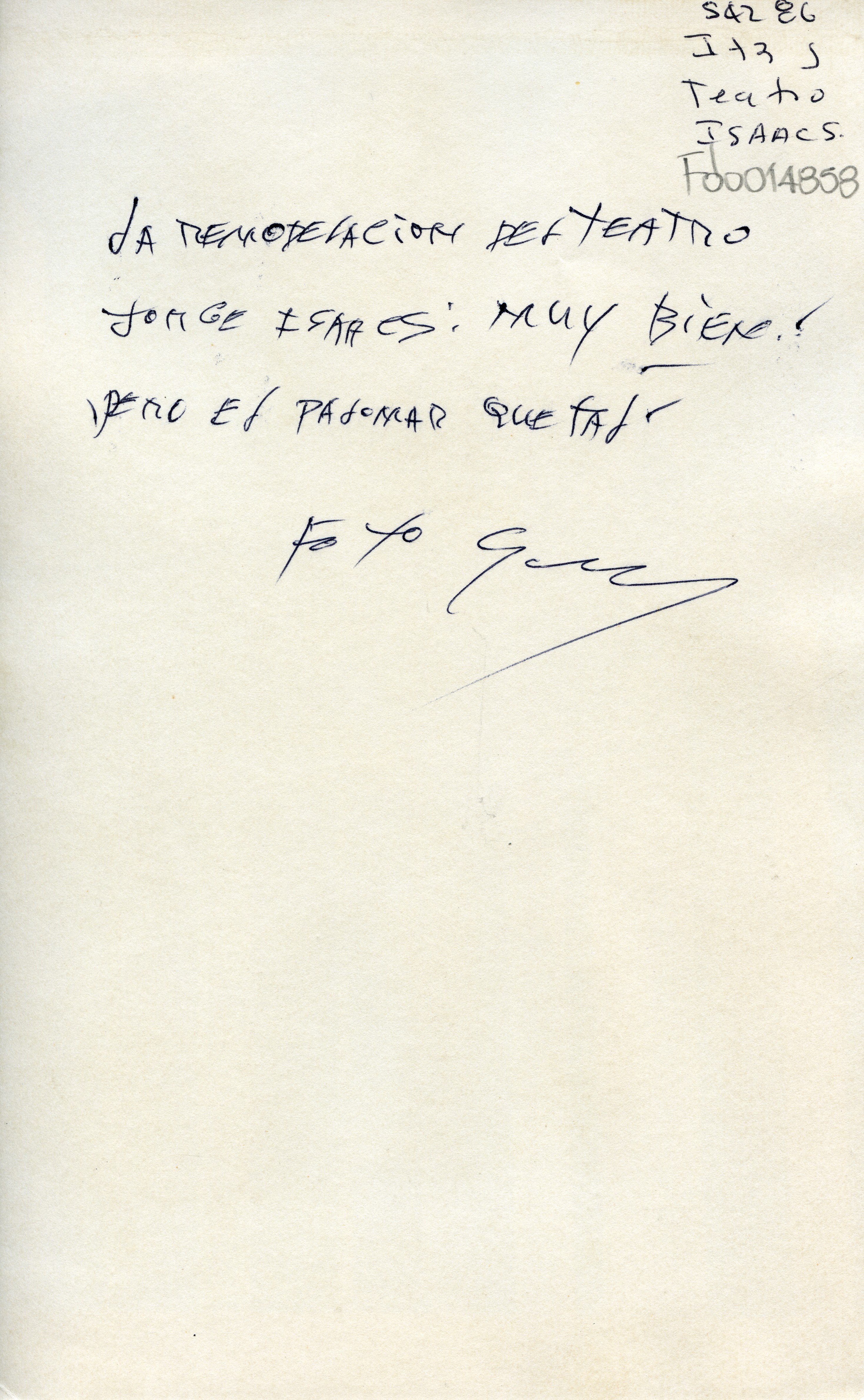 Teatro Jorge Isaacs será remodelado. Al reverso de la fotografía se escribe: "La remodelación del teatro Jorge Isaacs: muy bien! pero el palomar qué tal." Se observa una pequeña construcción en la parte alta del teatro.