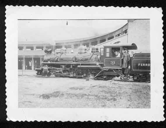 Locomotora estacionada en los talleres del ferrocarril, Chipichape. Santiago de Cali, 1930.