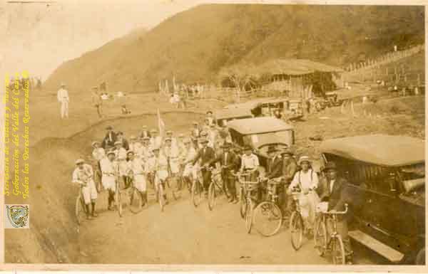 s. n., s. n., s. n., s. n. & s. n. (1927). Llegada de los ciclistas a la recta final, al lado los automóviles clásicos de la Época, que los acompañaron durante todo el recorrido & 200249. OTRO: Biblioteca Departamental Jorge Garces Borrero.