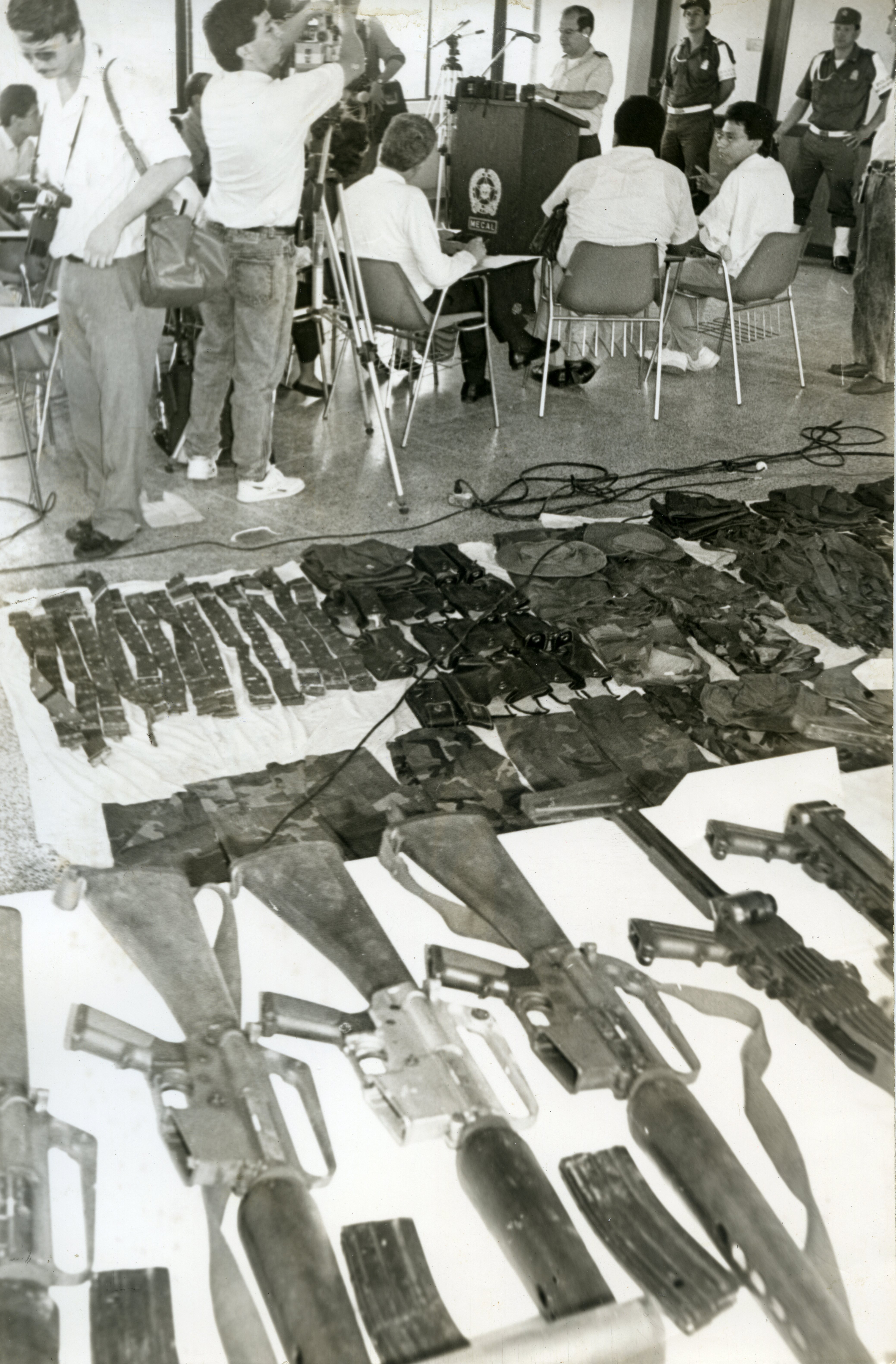 Legalización en rueda de prensa de material bélico incautado por la policía, se aprecian periodistas y el armamento incautado.