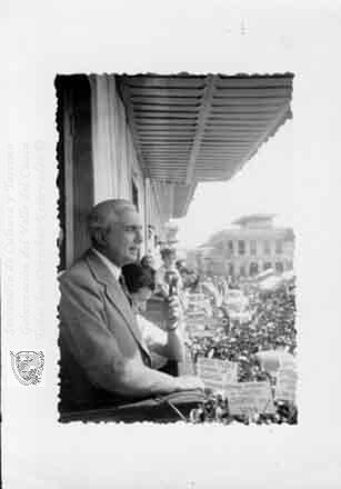 Mariano Ospina Peréz en su visita a Sevilla, fue recibido por una gran concentración pública en la Plaza principal. C.1948.