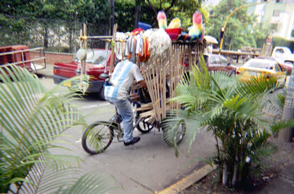 Contraplano de vendedor ambulante en bicicleta. Profusión de carros en escena. Variedad cromática. Arborización en laterales y franja superior. Exterior día.