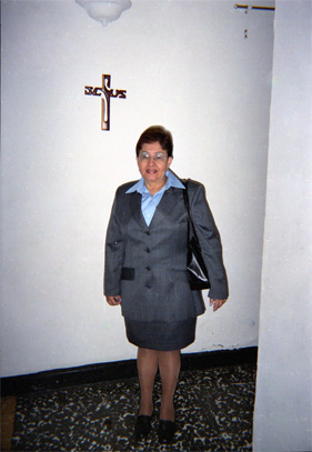 Plano medio. Núcleo familiar de la autora. En nivel superior una cruz con diseño especial.